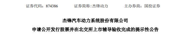 值得一提的是,9月24日,杰锋动力宣布,公司申请公开发行股票并在北交所上市辅导验收完成。3月11日,公司与国投证券签订了《杰锋汽车动力系统股份有限公司与国投证券股份有限公司关于向不特定合格投资者公开发行股票并在北京证券交易所上市之辅导协议》。