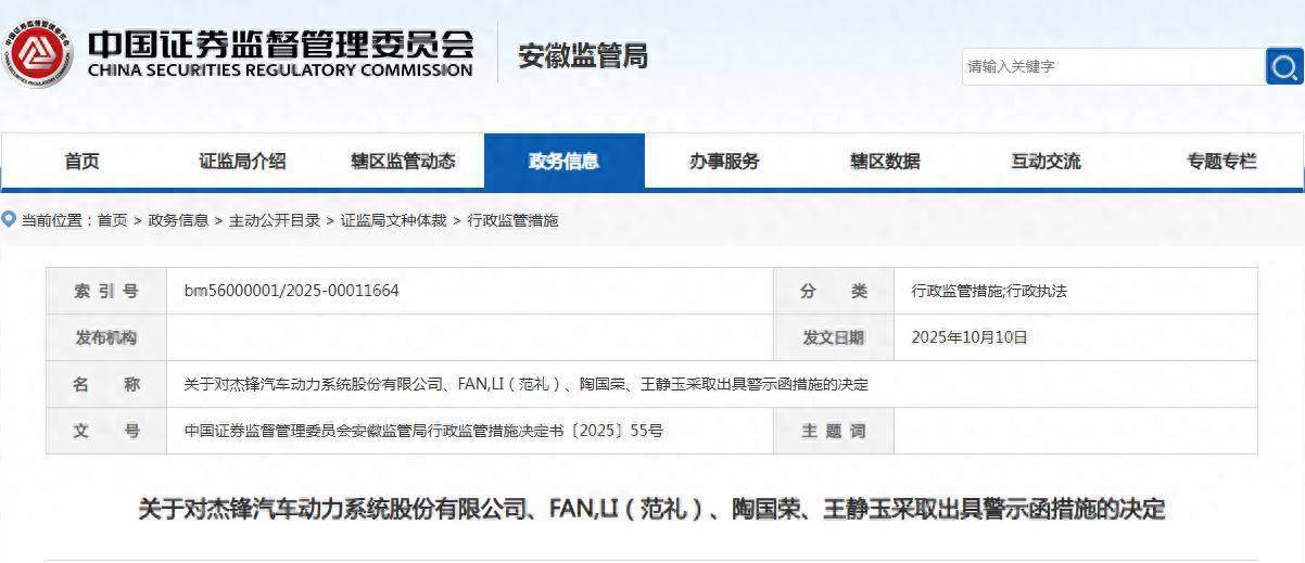 根据《非上市公众公司信息披露管理办法》第四十五条规定,安徽证监局决定对杰锋动力、FAN,LI(范礼)、陶国荣、王静玉采取出具警示函的行政监管措施,并记入证券期货市场诚信档案。